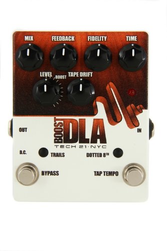 | The new, updated Boost DLA analog delay emulator pedal (DLA-TT V2) by Tech 21 features changing the former Flutter control to Tape Drift. Rather than evenly modulating the delayed signal, Tape Drift adds a random, unpredictable element which is more true to a vintage tape echo. Additionally, Triplets has become Dotted 8th. When engaged, it shifts the timing from 1/4-note mode to play back in dotted eighth notes for achieving those distinctive Pink Floyd/U2-style sounds. The look also has changed to complement the line. All other main features remain intact: Dedicated Tap Tempo function footswitch; clean Boost function for up to 9dB of added volume; a single, continuously-variable Time control with a smooth, full sweep of delay up to 1,000 milliseconds; Trails to allow the natural decay of the delay signal rather than cutting it off abruptly; and Feedback which can be thrown into a state of self-oscillation. Great for gigs when the Klingons are in town. Mix, Feedback, Fidelity (formerly designated as "Tone") and Level controls are 100% analog for authentic, organic sounds and no latency. The Boost DLA is engineered so the user can explore and custom tailor such delay styles as vintage tape, bucket brigade as well as digital. Designed with user-tweakable, "lo-fi" analog technology, you can manipulate the controls to infuse degrees of warmth and life characteristic of vintage delays. This circuitry intentionally injects the inherent imperfections of vintage units, which is what makes them so seductive and nostalgic. Other features include 1megOhm high-impedance 1/4" input, 1kOhm low-impedance 1/4" output, custom silent-switching actuator, sturdy metal construction. Operable with 9V alkaline battery (not included) or optional DC power supply (Tech 21 Model #DC2). Designed and manufactured in the U.S.A. ...Read